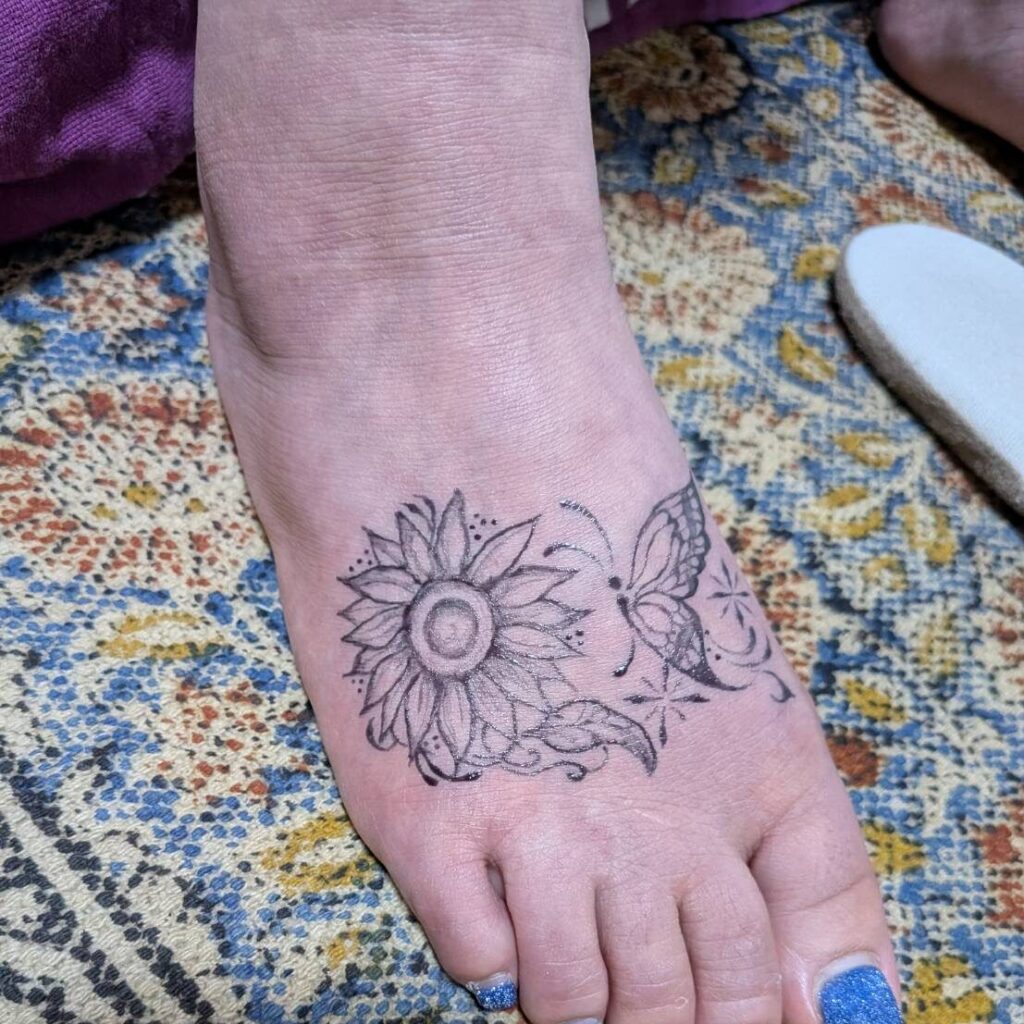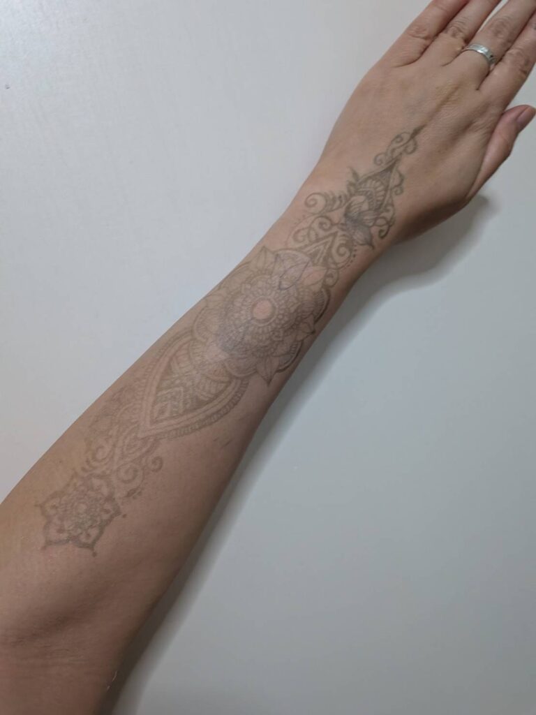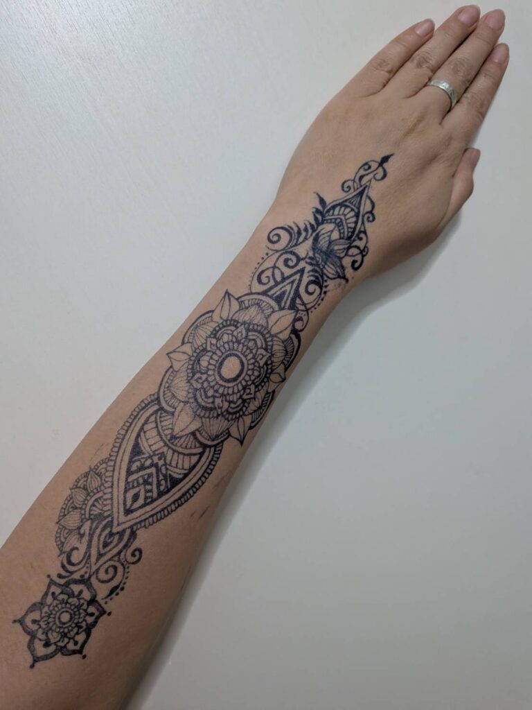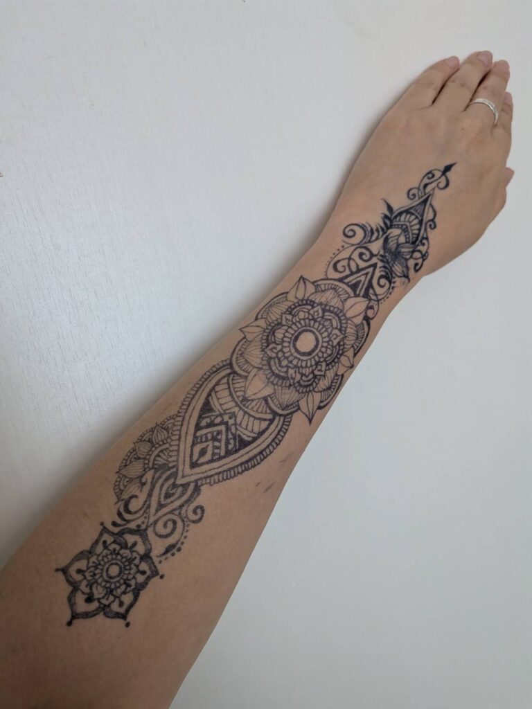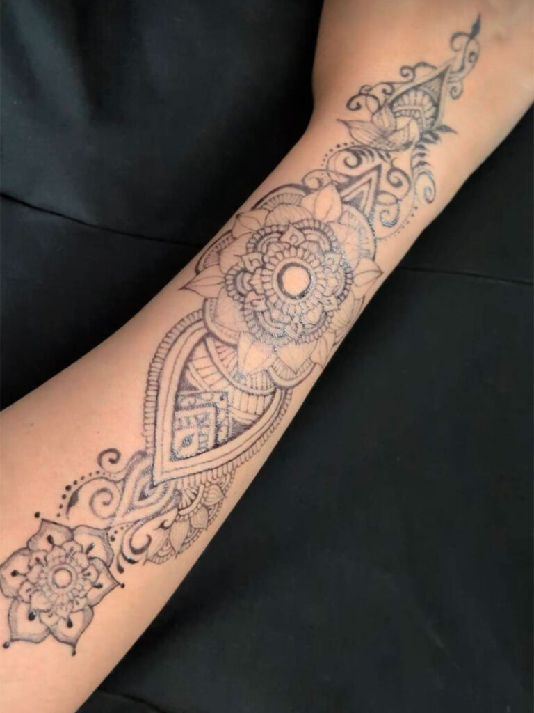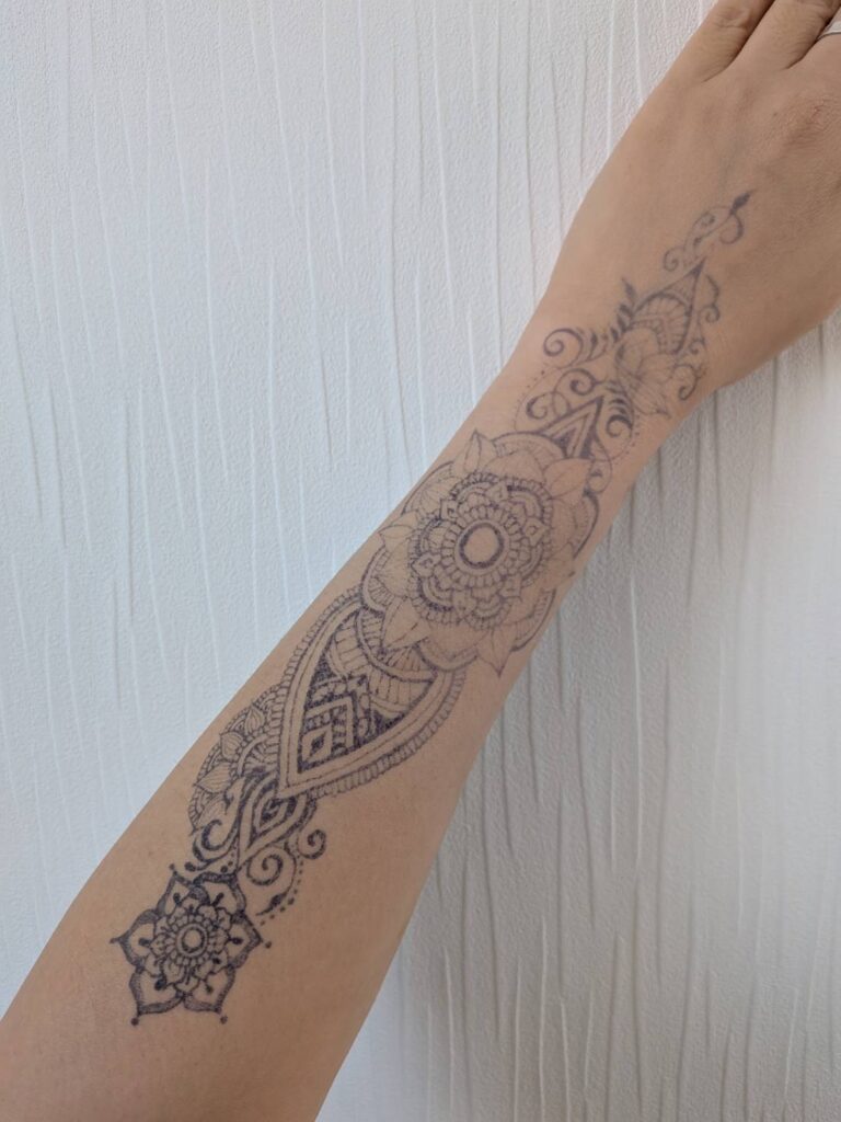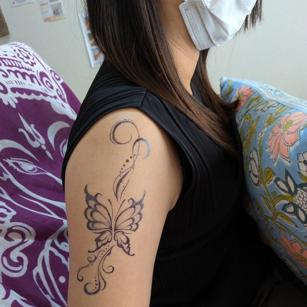 メヘンディのようなデザインを描くこともできます。またジャグアタトゥーは細い線もしっかりと発色するためレタリングやシンプルなマークも得意。タトゥー風のデザインやイラストレーション等も人気が高いです。