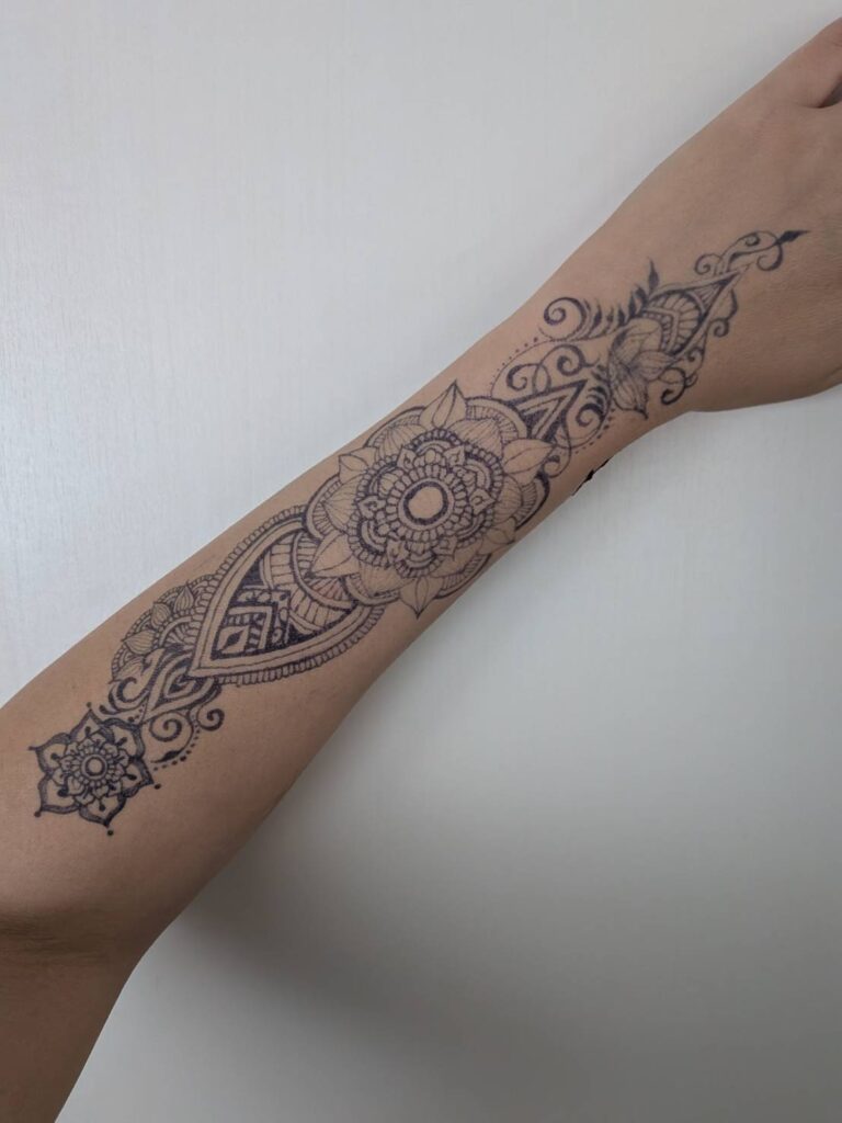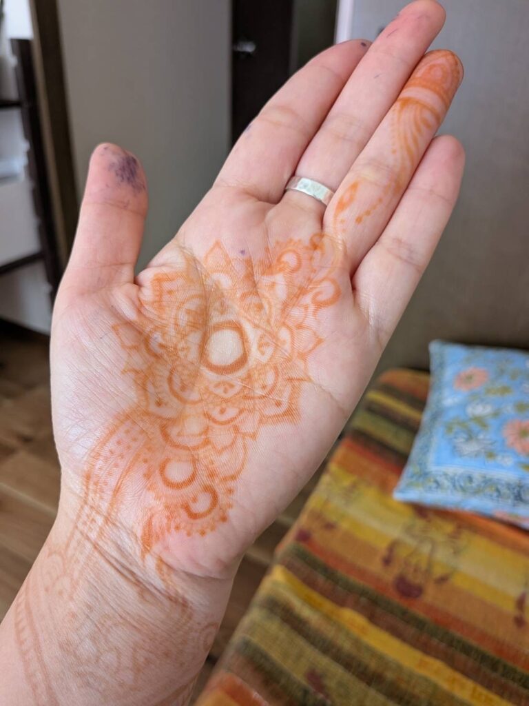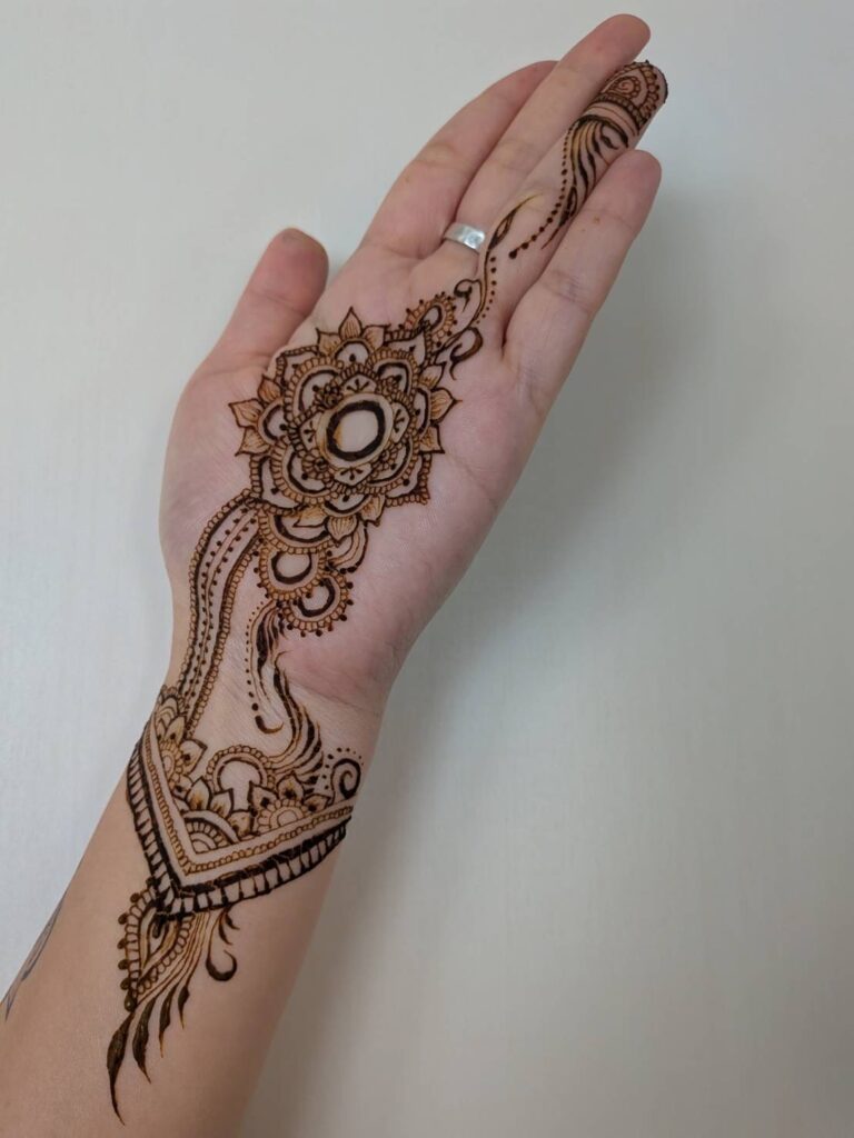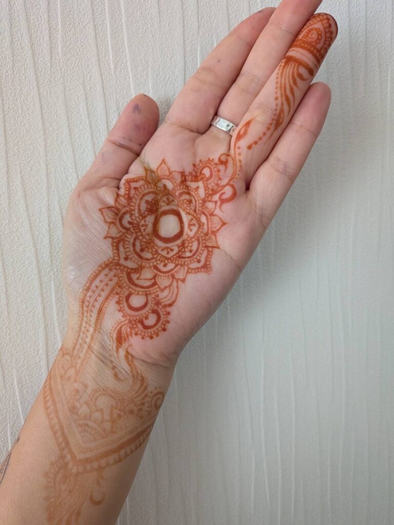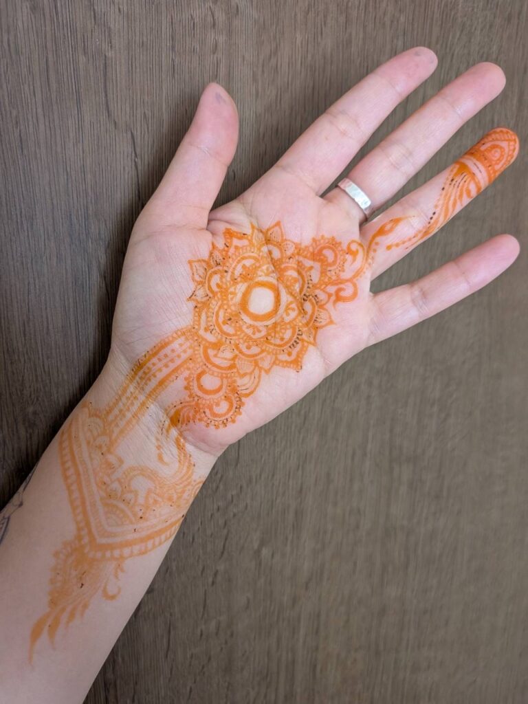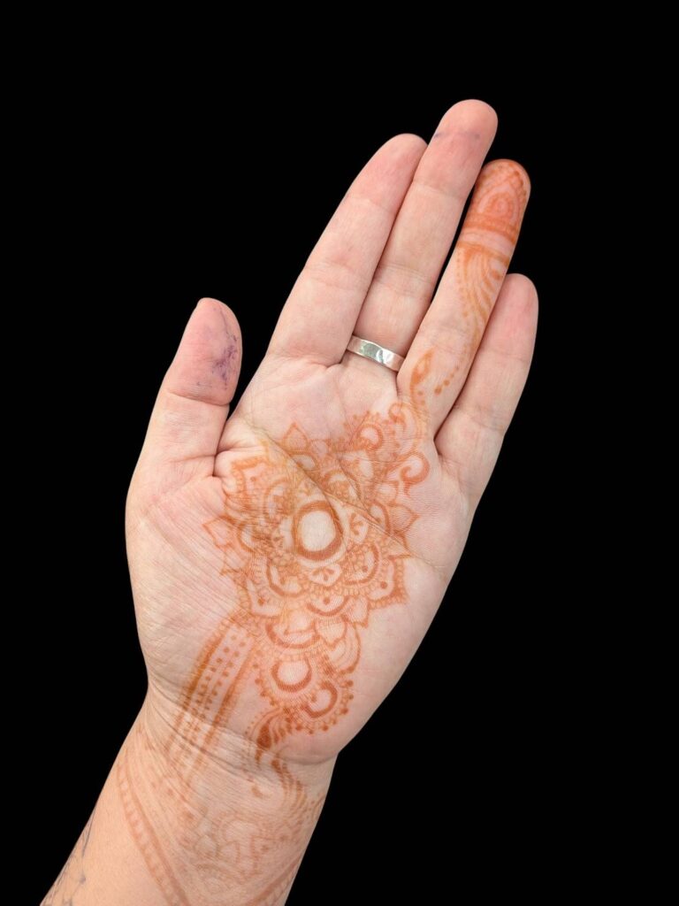 メヘンディは伝統的な細かい模様や流れるようなデザインがあり人気のモチーフもあります。モチーフ事に縁起の良い意味がつけられていることもありますが基本的には『ヘナで肌を染めること』こそに一番意味があると私からはお伝えしています。好きなモチーフやイメージをお伺いしたらフリーハンドで描いていきます。
